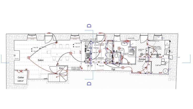 Cotation détaillée, indication des matériaux, agencements, détails architecturaux pour devis artisans